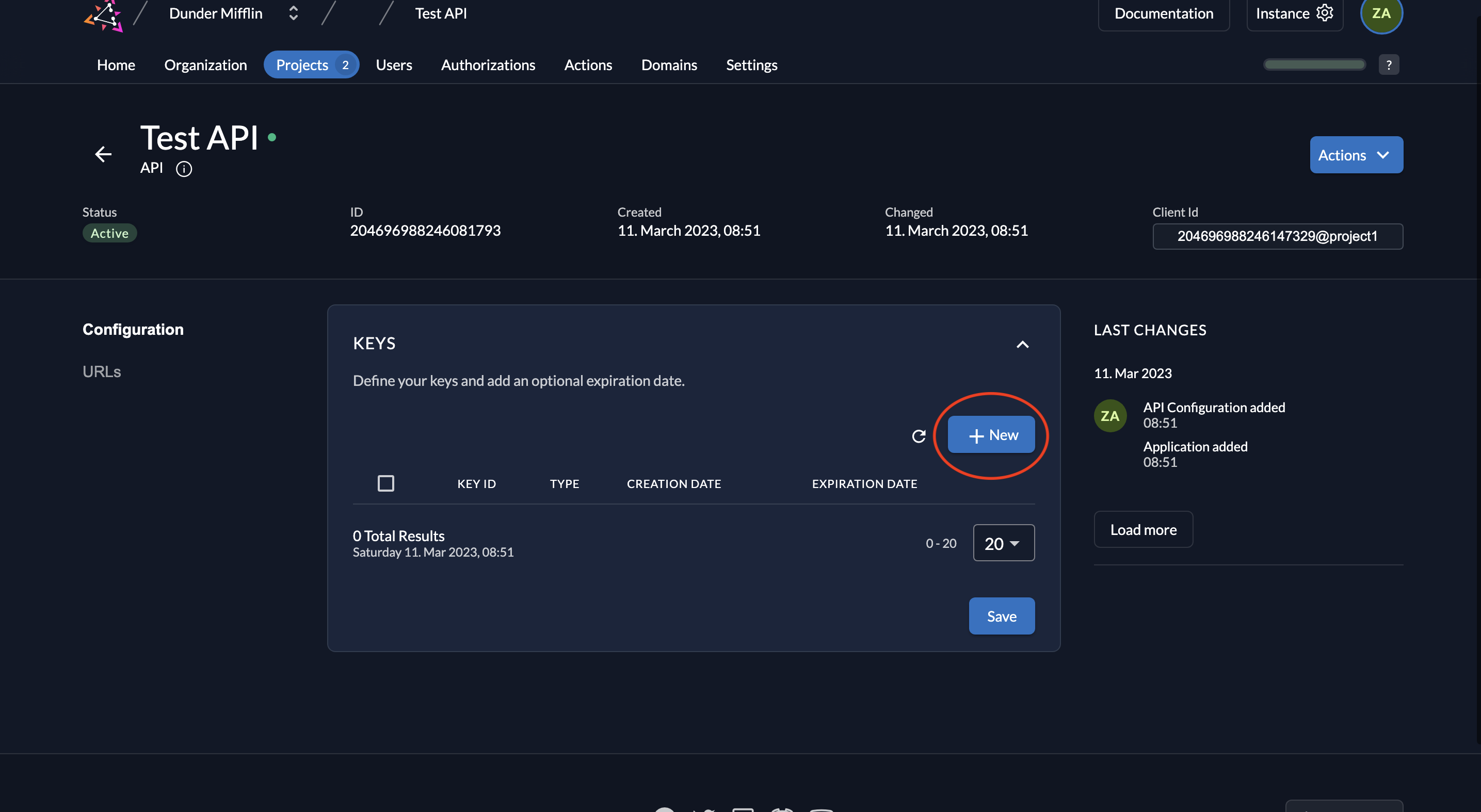 - To generate a key pair, click New under the application’s keys section.